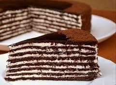 - Ia o tavă de copt cu fund detașabil cu diametrul de 22-23 cm. și unge baza ei cu cremă, aranjează prima foaie, întinde pe ea 2-3 linguri de cremă și tot așa până termini toate foile. La sfârșit trebuie să-ți rămână circa 2 linguri de cremă. Acoperă tava cu folie alimentară și pune tortul la frigider pentru 6-8 ore sau peste noapte.